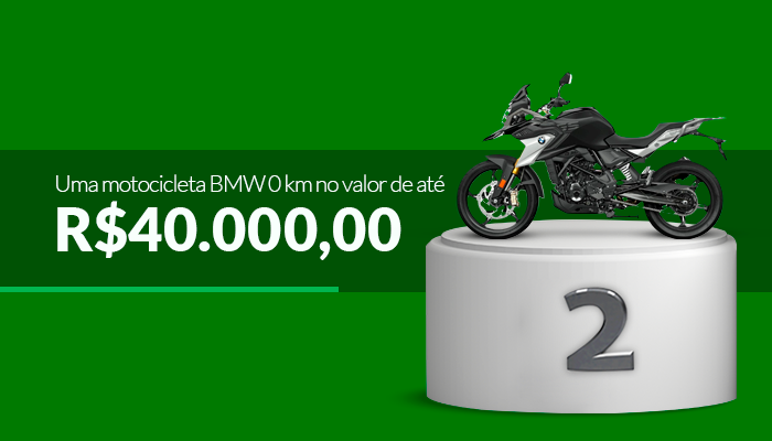 - 2º lugar: uma motocicleta BMW 0 km, ou similar, no valor de até R$ 40.000,00 (quarenta mil reais) ou o mesmo valor monetário mediante a emissão de recibo;