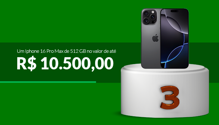 - 3º lugar: um celular Iphone 16 Pro Max de 512 GB no valor de até R$ 10.500,00 (dez mil e quinhentos reais) ou o mesmo valor monetário mediante a emissão de recibo.